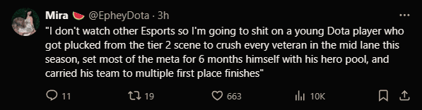 "I don't watch other Esports so I'm going to shit on a young Dota player who got plucked from the tier 2 scene to crush every veteran in the mid lane this season, set most of the meta for 6 months himself with his hero pool, and carried his team to multiple first place finishes"
