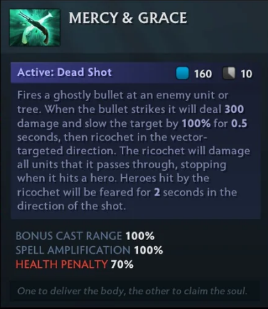The lore states, “One to deliver the body, the other to claim the soul.” This addresses the two names, Mercy and Grace. This also indirectly confirms that Muerta has two guns and is a dual-wielder. This item has a 100% bonus cast range and a 100% spell amplification. It also applies a 70% “health penalty” which means you’ll lose 70% of your HP once you use it.