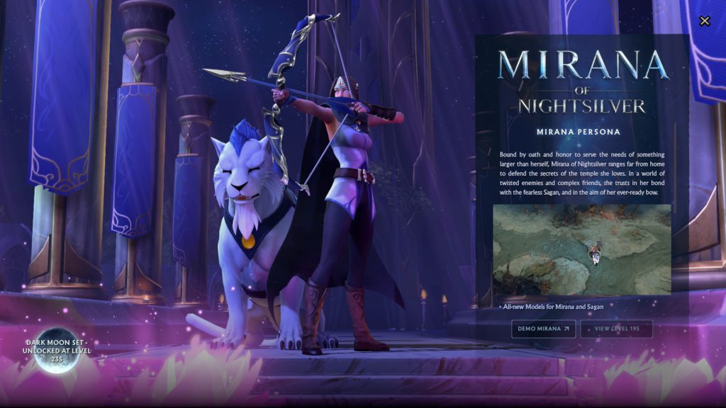 To start, one of the biggest rewards is a new persona for Mirana. Considering Mirana has long bee lambasted for her very out of date model, this is a welcome site. The persona is based of the version of Mirana in the Dragon’s Blood Anime. Netflix recently announced the second season of the show. The Persona is meant to be a follow up to the Dragon Knight Persona that came with the Nemestice Battlepass. The Persona unlocks once you reach level 135 of the Battlepass. You can also get an alternative style for the Persona once you reach level 235.