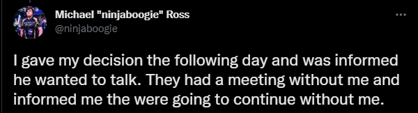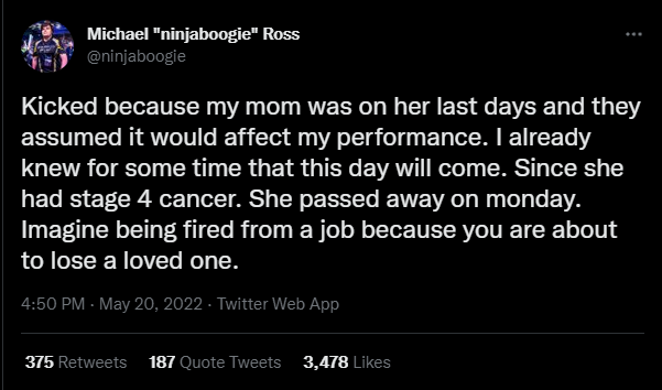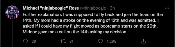 Not long after, he posted his explanation of how the kick happened. According to ninjaboogie, his late mother “was on her last days” due to stage 4 cancer. The organization assumed that this would affect his performance and decided to kick him from the team.