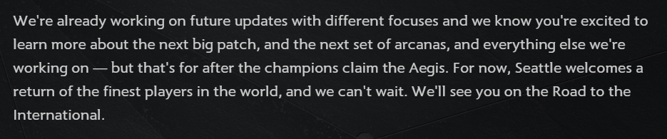 “We’re already working on future updates with different focuses and we know you’re excited to learn more about the next big patch, and the next set of arcanas, and everything else we’re working on – but that’s for after the champions claim the Aegis,” the post stated.