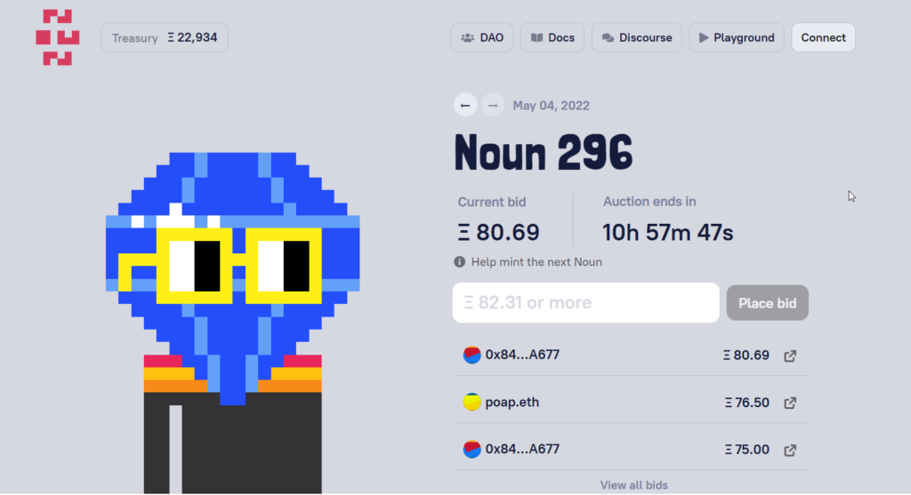 It appears that daily, these “Nouns” are auctioned off using the digital crypto currency Ethereum. These auctions are then used in a sort of governmental system for regulating the NFTs and currency. You can look at their website to get a better sense of what exactly this means.