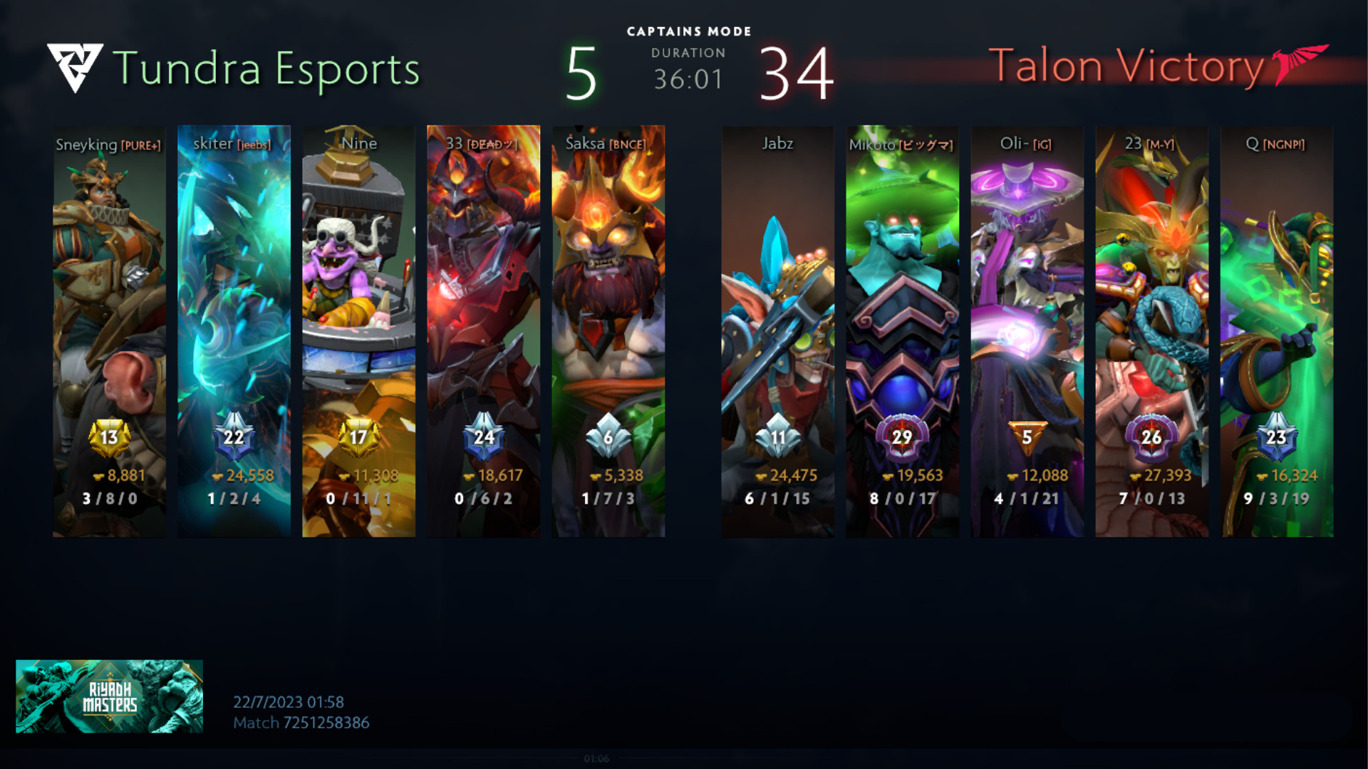 The second game was a landslide victory for Talon who ended the game with 34-5. Jabz also dominated the game and went 6-1 on his Meepo. However, he is not the only person to play the hero at Riyadh Masters.
