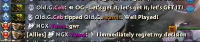 Soon after, Topson all-chatted a “g” (go) despite Aramis still logged off from Dota 2. NGX’s Yuma “Yuma” Langlet typed a question mark but Old G unpaused the game anyways, purposely moving into the series playing 4 vs 5. Throughout the game, Old G controlled Aramis’ Bounty Hunter, trying their best to make it out handicapped.