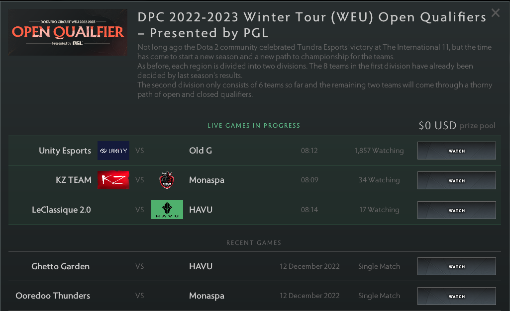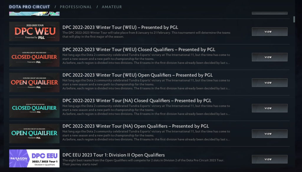 For consistent live games, your best bet is in the Dota 2 client itself. Firstly, go to the Watch Now tab > Tournaments > Dota Pro Circuit. Then, you can select which region’s qualifier you want to watch. Click ‘View’ and the tournament’s page will list replays and live games that are ongoing.