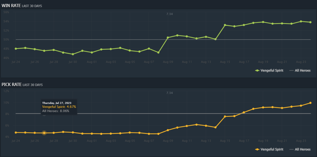 As you can see from the Dotabuff chart above, Vengeful Spirit had a sharp increase on her win and pick rate since patch 7.34 dropped. Between July to August 24, her pick rate rose from around five percent to 10 percent. Meanwhile, her win rate jumped to 53 percent from 47 percent. Sure, those numbers were based on Vengeful Spirit as a whole, and not a support specifically. However, this did not discount the fact that there was something going on with this hero. So what exactly happened?