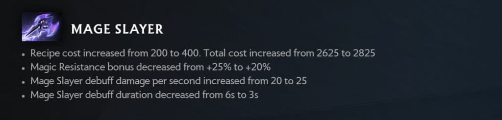 The Mage Slayer was also hit by a barrage of nerfs. This includes an increase in recipe cost, a 5% decrease to its Magic Resistance bonus, and a decrease to its debuff duration (from 6s to 3s). But Valve wants to keep the item afloat, adding a 5 damage per second increase to the debuff damage.