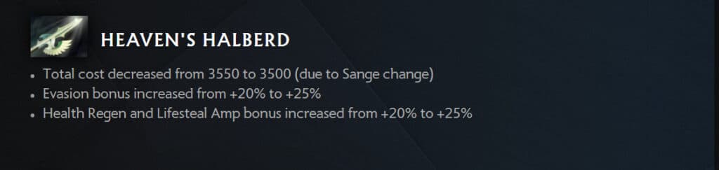 The Black King Bar also got a good buff, adding the magic resistance from 50% to 60%. Heaven's Halberd will likely soar in the meta next, as it now rocks a higher evasion, health regen, and spell amplification.