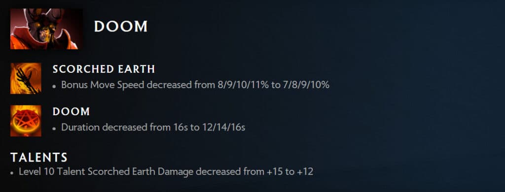 Doom's bonus movement speed is now decreased, its ultimate's duration decreased massively in early game, and its Scorched Earth talent damage decreased.