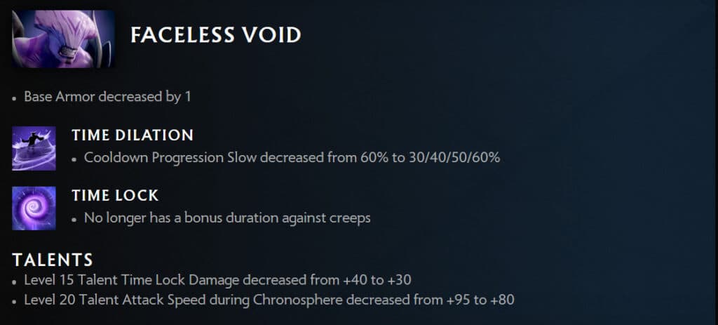 Next big nerf is the Faceless Void. Its Time Dilation cooldown progression slow is decreased in the early levels. Time Lock also no longer has a bonus duration against creeps. His Talents also tank some nerfs, with the Time Lock damage decreased and attack speed during Chronosphere decreased.
