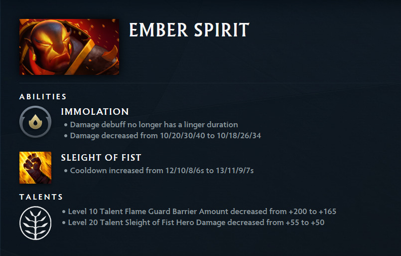 | Ember Spirit | Innate Immolation Damage debuff no longer has a linger duration Damage decreased from 10/20/30/40 to 10/18/26/34