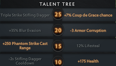 Lifesteal on a carry? Should be an easy choice! WRONG! Keep praying for your Possessed Mask and pick Phantom Strike Cast Range. This talent allows PA to jump the backlines with ease, and have a much bigger game impact than 12% Lifesteal ever could.