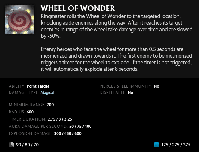 Ringmaster's ultimate ability is the Wheel of Wonder. He releases a large wheel to an area, damaging enemies in its path. The wheel will stop at the targeted location and enemies nearby will receive damage per second. Those who face the wheel for 0.5 seconds will be taunted and pulled towards the wheel. After the timer ends, the wheel explodes, dealing massive damage.
