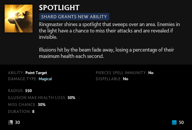 The Aghanim's Shard grants Ringmaster an extra ability called Spotlight. This ability shines a spotlight that sweeps over a selected area that will reveal invisible units and damage illusions.