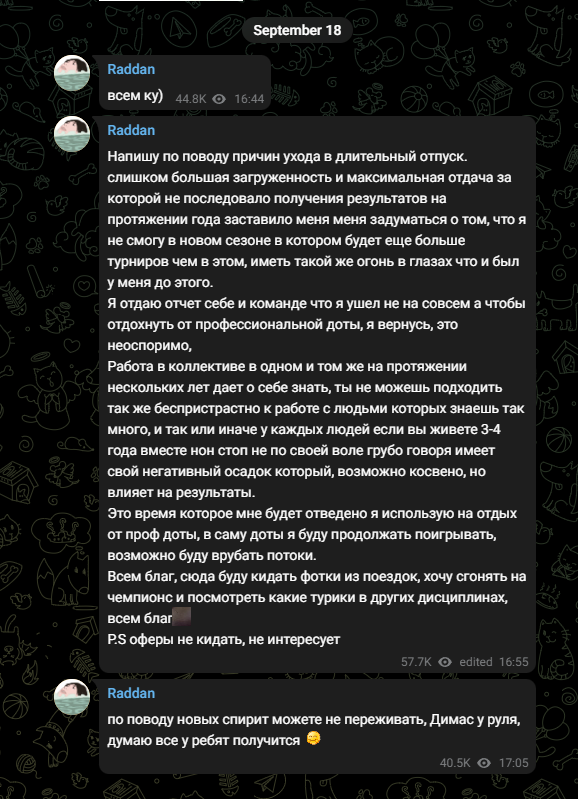 Yatoro also shared his thoughts on his Telegram channel. He mentioned that despite his hard work and focus over the past year, he didn’t achieve the results he wanted. This made him reflect on whether he could maintain the same passion and energy in the upcoming season. He made it clear that he’s not leaving Dota 2 for good, but rather taking time to recharge and will eventually return.