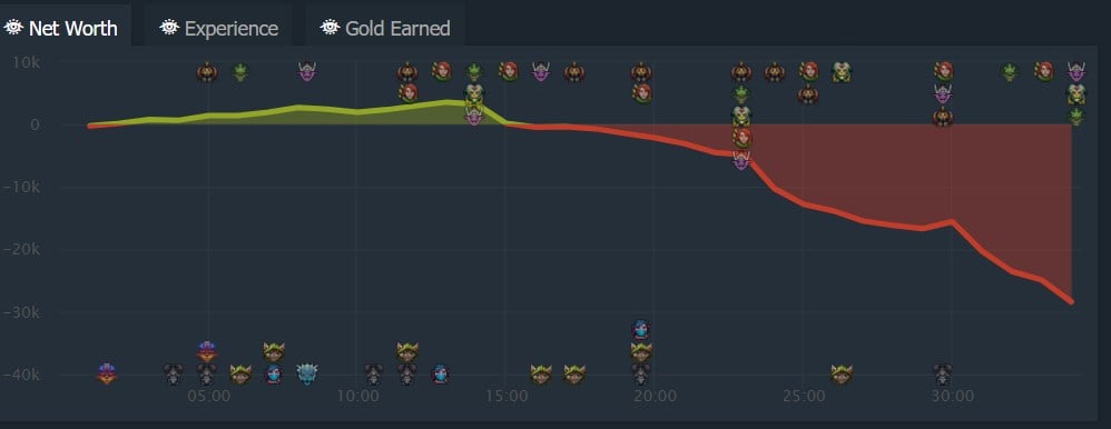 After that, as is visible in the graph above, it was all downhill for Team Aster. PSG.LGD built on its lead, securing objectives and slowly but surely controlling the map. PSG.LGD took the lead in the elimination match and was just one game away from a lower bracket finals appearance.