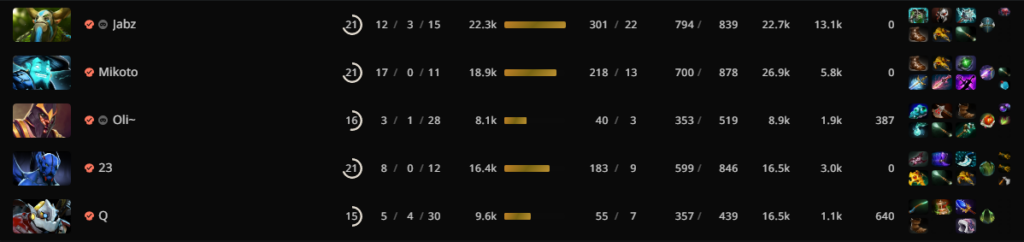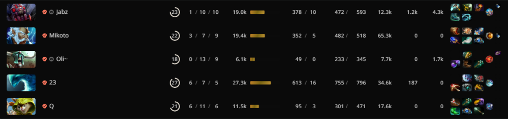 By only 20 minutes, the team accumulated 30 kills and they did not slow down. They constantly picked off kills and while SMG spent most of their time trying to get some control of the map, Talon raked a giant net worth lead. Jabz led with a 22K net worth and SMG’s cores struggled to reach the 10K mark. SMG wave the white flag and surrendered after 28 minutes.