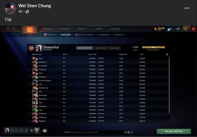19-year-old W sure lives up to his name as he posts the mind-blowing achievement on his Facebook account. He shared a screenshot of his 15,0007 MMR with a simple caption – “15k”. Talon Esports and many other Dota 2 fans congratulated him for reaching the unprecedented milestone. He also goes by other names such as Shenorita and Ws`.