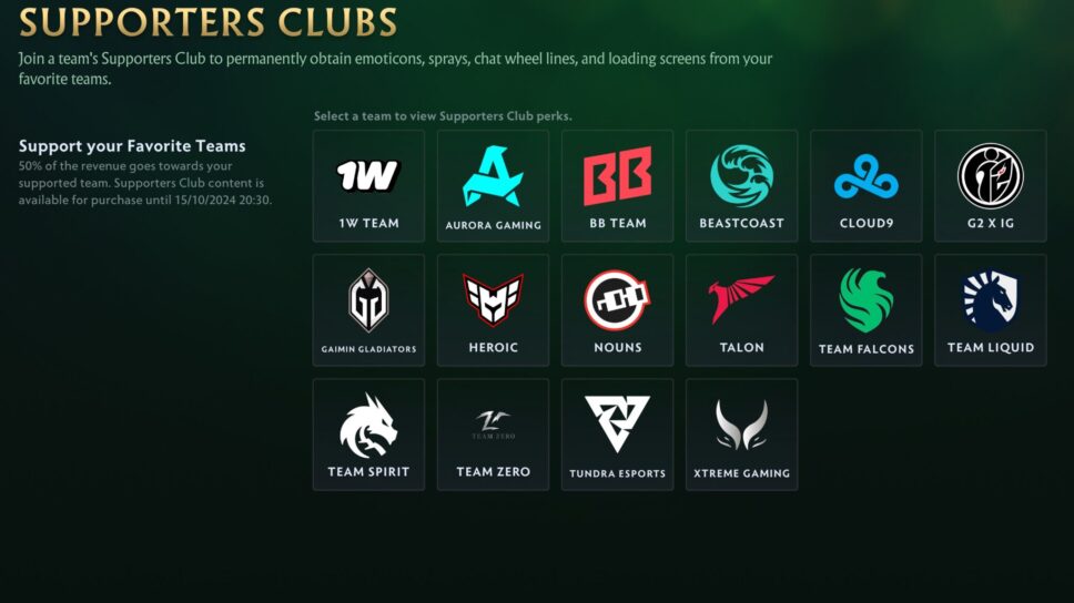 Finally, the Gold Tier of Supporters Club will grant exclusive access to the team’s choice of chat wheel voice lines. In addition, the team’s logo will also be displayed near the HP bar of heroes in-game. There’s also three HP Bar emoticons for players to show off their support for their favorite team.