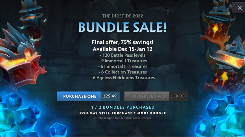 This bundle is identical to The International 11 Battle Level Bundle that appeared on Oct. 13, 2022. As with then, purchasing the bundle will land you 120 Battle Pass levels, nine Immortal I treasures, six Immortal II treasures, and six of each Collection and Ageless Heirloom treasures.
