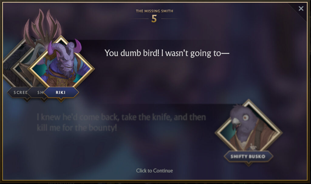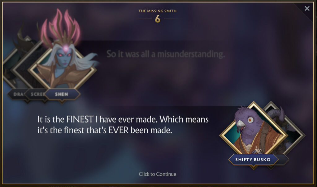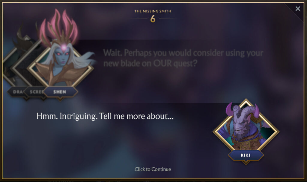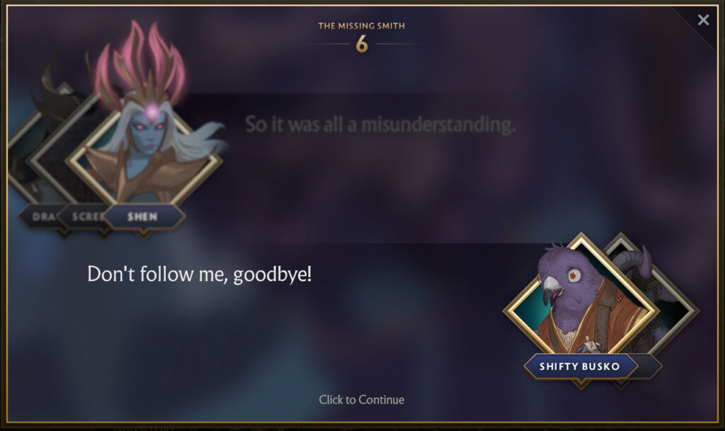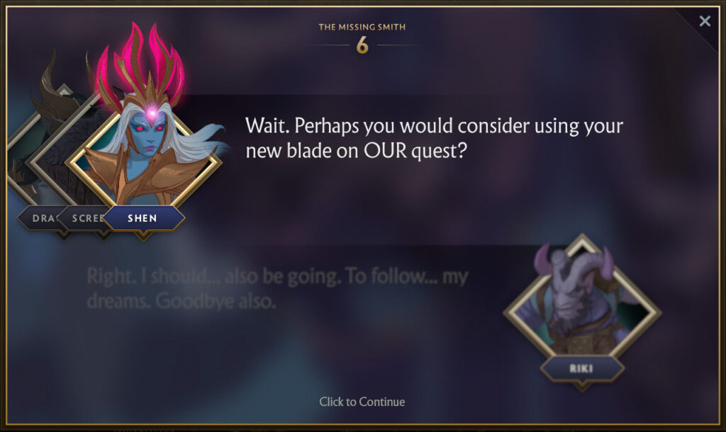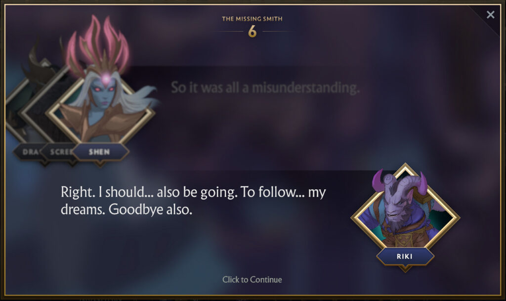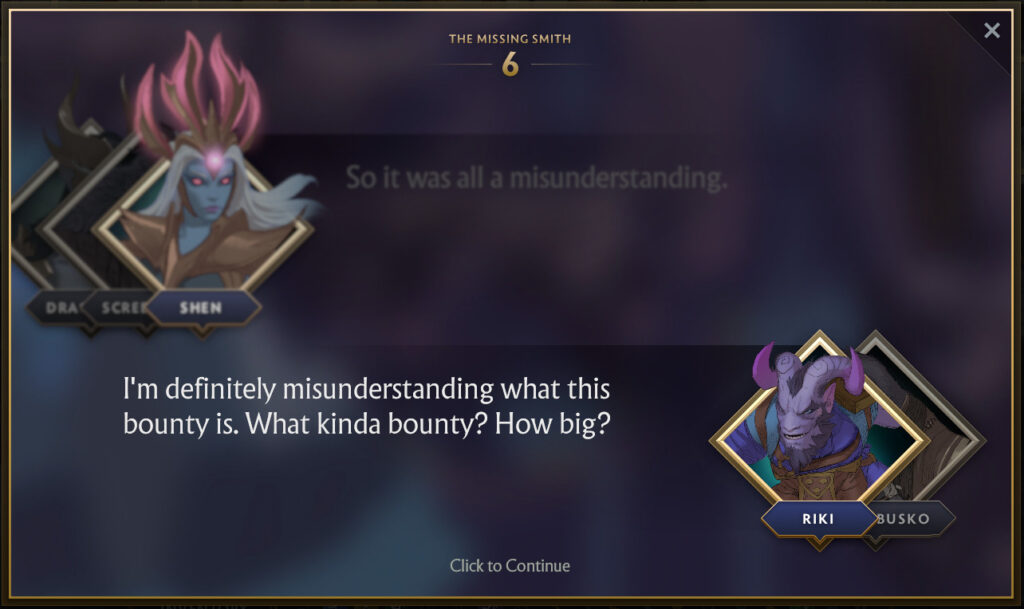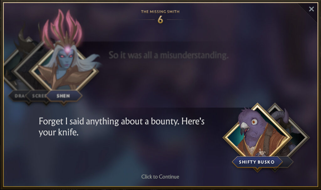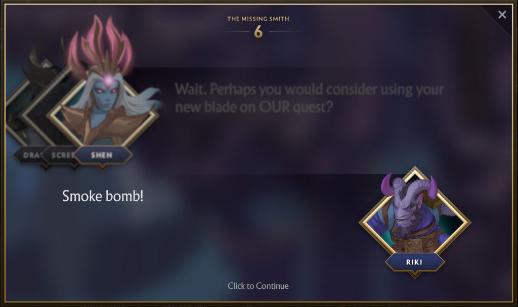 It turns out that Riki has hired the best blacksmith on this side of the Abyss, Shifty Busko to craft him a new dagger. Despite Riki paying in advance, the blacksmith has gone missing. This predicament has given the same level of frustration that support players that have to play against Riki, to Riki. And so Shen decides she wants to help Riki find the Smith, and subsequently his dagger.