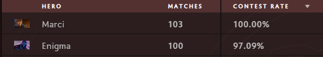 Marci has a 100% contest rate while Enigma has a 97% contest rate. This will probably continue through the rest of The International, as the heroes are just too strong at the moment.