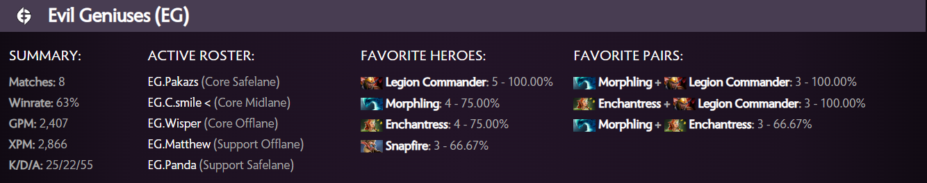 They put a lot of stock in Legion Commander having picked the hero five times and won all of the games. Furthermore, they have played Legion Commander on all lanes (safelane, offlane and midlane). Morphling and Enchantress are the other heroes that have brought them success.