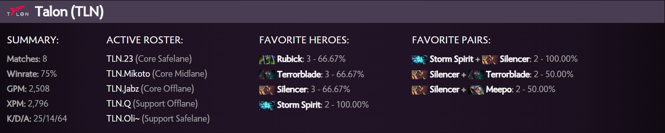 Talon utilize a combination of strong traditional heroes such as Storm Spirit, Silencer and Terrorblade. On their comfort heroes, they manage to accumulate positive win rates (above 50%). That said, they are unafraid in experimenting once in a while with occasional random outliers like Offlane Meepo.
