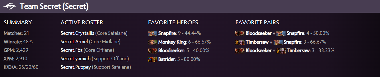 Team Secret are now comfortably sitting at the fourth place of their group with a 4-4 score. They still have much to prove. But if they can secure more wins in the final days of the Group Stage, they will likely move forward to playoffs. As of now, Batrider is their strongest hero with 80 percent win rate. Meanwhile, their best hero combination is Timbersaw and Snapfire.