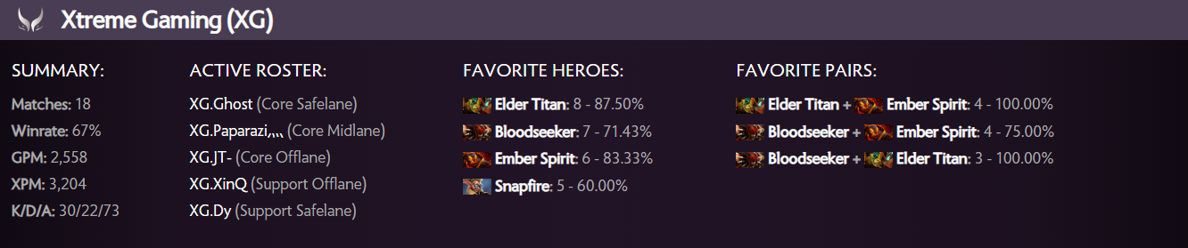 Elder Titan, Ember Spirit and Bloodseeker seem to be their strongest assets having earned high win percentages on those heroes. It is also important to note that Xtreme Gaming is currently the only team that managed to defeat Quest Esports 2-0.