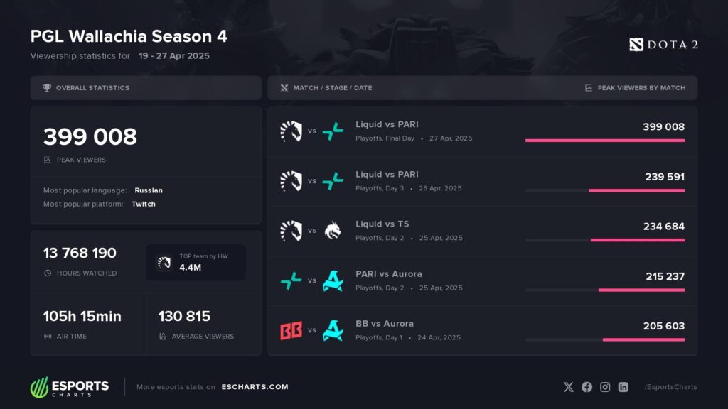 On the other hand, PGL Wallachia Season 4 nearly broke the viewership record set in Season 1. According to Esports Charts, the grand final peaked at almost 400,000 concurrent viewers — a strong number for a game with monthly Tier 1 events.