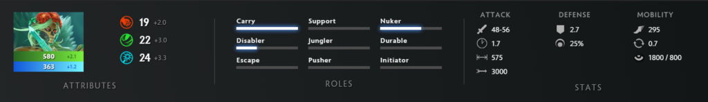 Muerta is an Intelligence hero as her INT stats are the highest and scales the best. She starts the game with 19 Strength, 22 Agility, and 24 Intelligence. She is most suitable played as a carry hero, courtesy of her multishot passive and high damage ultimate.