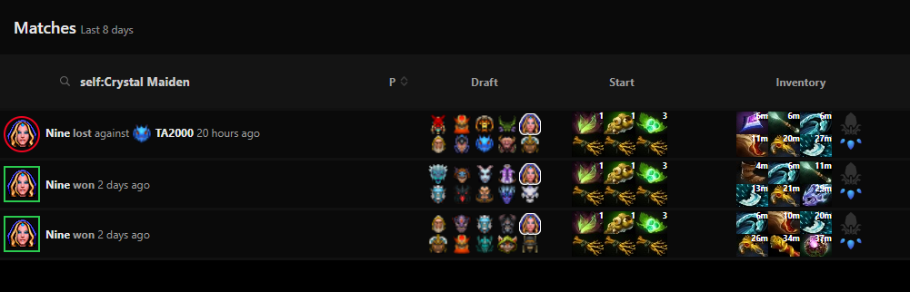 It’s always interesting to look at Tundra’s hero choices, as they are even known for setting trends in pubs. Nine is spotted playing a variety of mid heroes including Nature’s Prophet and Doom. Interestingly, he also played 3 matches of midlane Crystal Maiden, building items like Moon Shard and Monkey King Bar.