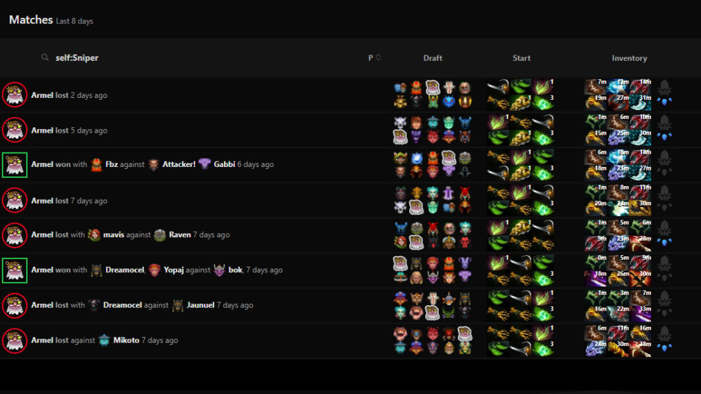 - Armel: Sniper (8), Storm Spirit (6), Templar Assassin (5)