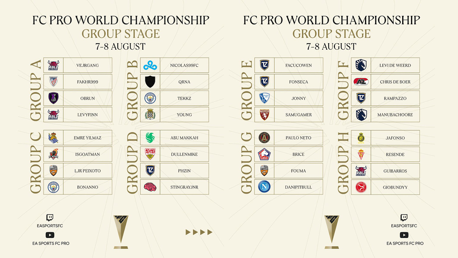 Here are the eight groups, with each player going head to head once. There are some tough matchups, including the highly anticipated clash between Nicolas and Tekkz in Group B.