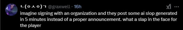 You’ve got people saying a simple graphic would have sufficed, giving a true creative worker a role in the announcement. Others simply express their disappointment in the use of AI for the reveal of a world-renowned player signing to Gen.G.