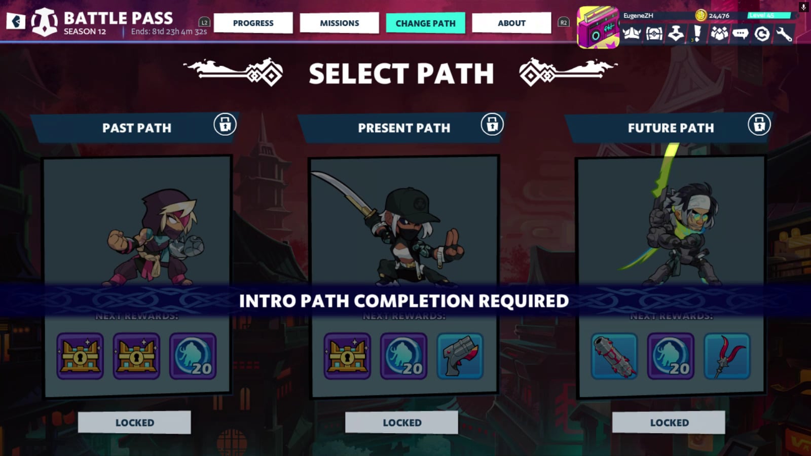 - After the Intro Path, you can select to proceed with the Past, Present, or Future Paths. Brawlhalla Season 12 is long enough to complete them all, so the choice is rather about which items you want to unlock first. It is possible to switch between the Battle Pass tier tracks at any time. To advance further, you need to unlock 23 tiers in each Path.