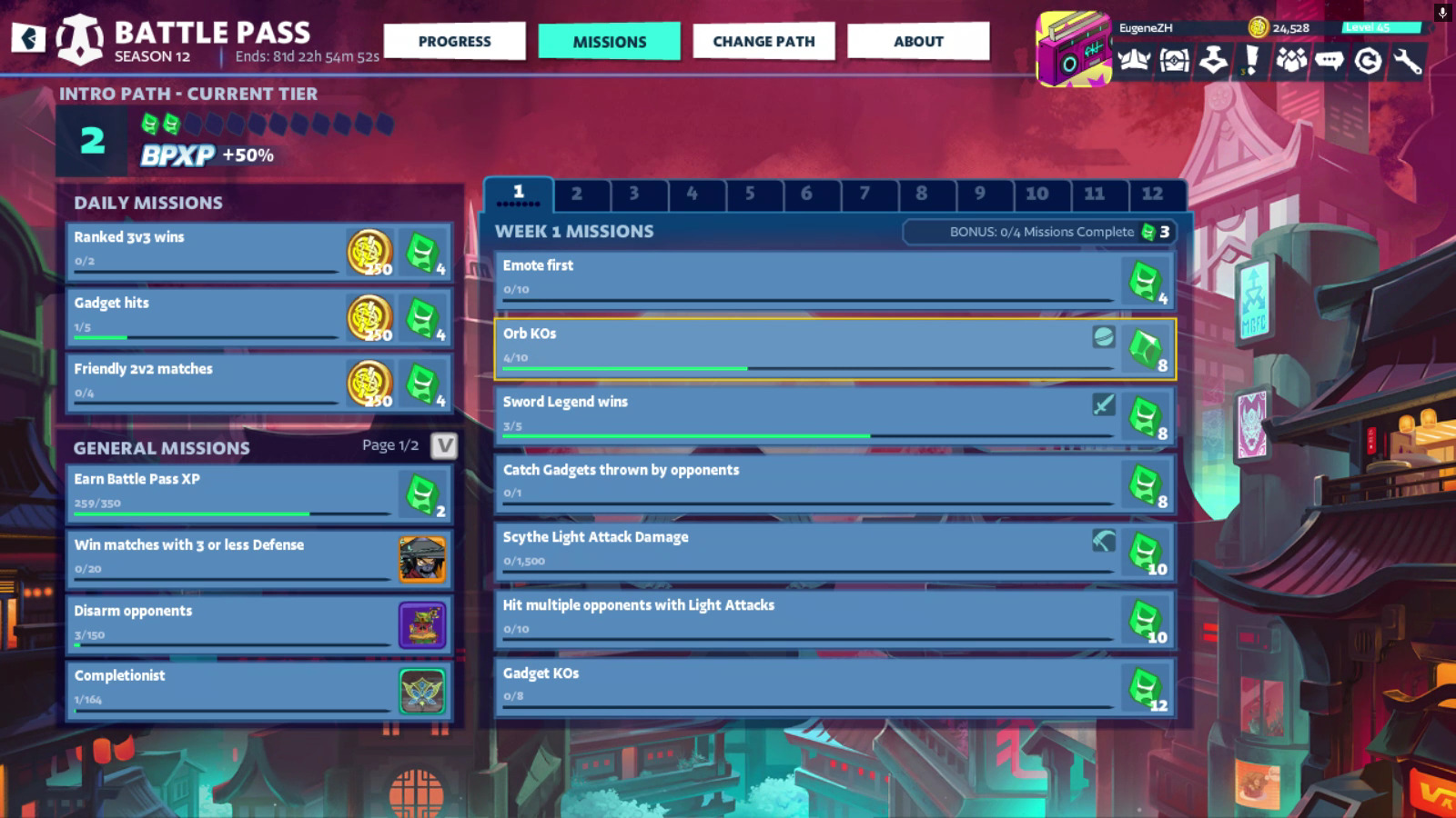 To progress through the tiers, you should play Brawlhalla and complete missions of Battle Pass Season 12.