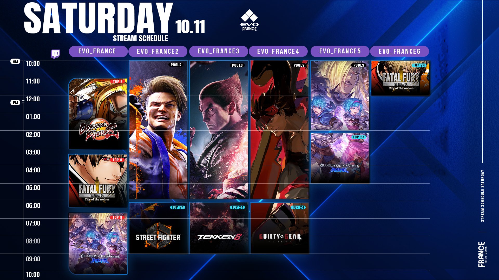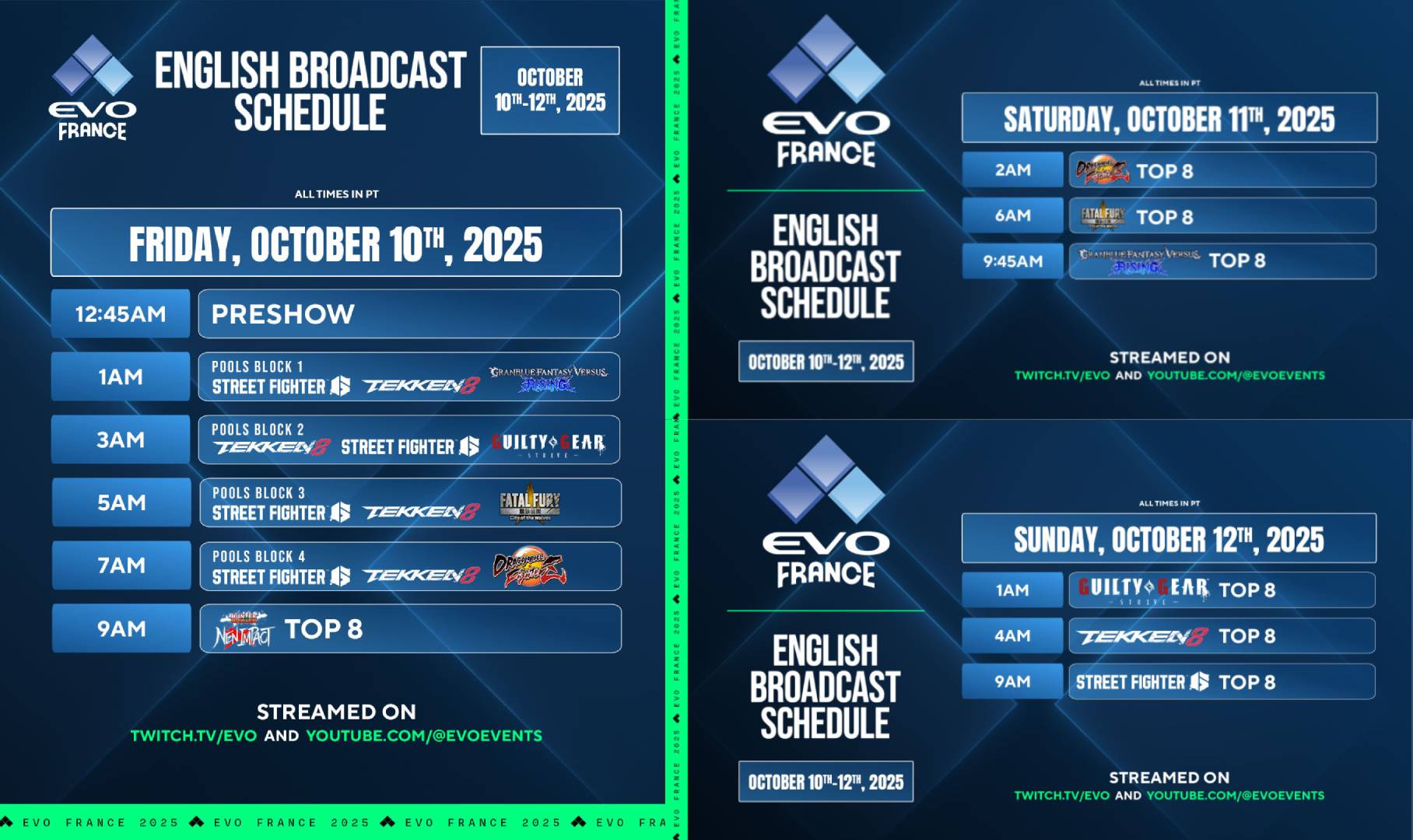 The event goes on for three days, from Oct. 10 to Oct. 12. The official English stream schedule of Evo France 2025 is shown in the image below.