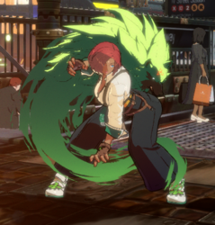 When he is in his Brynhildr Stance, his kick can be dash or jumped canceled, opening up more options. Because his dash in this stance can cross up the opponent, they will have to be aware of potential side switches at any point. Pressing the dash button will always move him towards the opponent now. This makes his side switch mix-ups more potent, both when the opponent is knocked down or blocking.