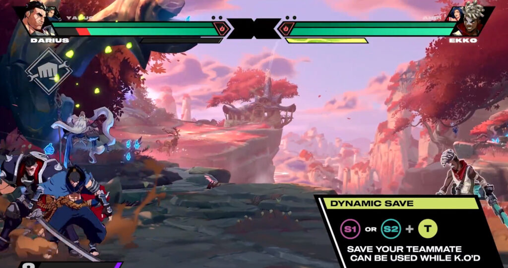 A new feature to Project L, the Dynamic Save is best compared to the Drive Reversal in Street Fighter 6. Costing some meter, the move calls in your partner to stuff an attack while blocking. However, this move is usable even if your partner has already been KO’ed. However, use of it is limited and it can be countered for a big ole Happy Birthday–a fighting game term for when multiple opponents on the screen get hit by an attack at once.