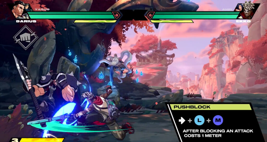 A fighting game staple, the pushblock allows you to shove an enemy away while blocking. This creates space for you to either reset, start your own attack, or collect yourself. This will cost 1 bar of meter, so don’t go too crazy.