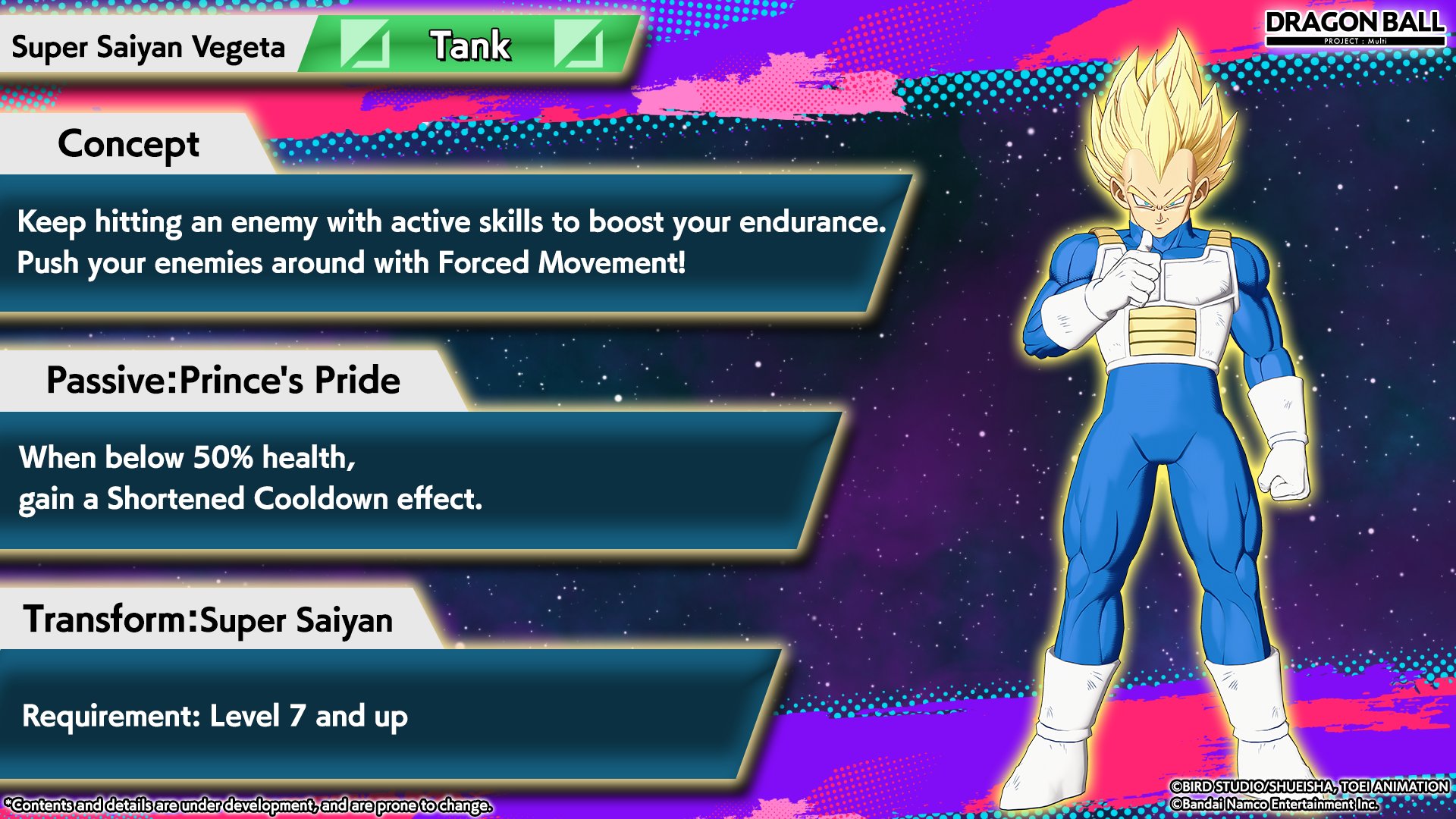 In this game, Vegeta is a tank character who can aggressively attack opponents and even benefit from getting damage. When the health of Super Saiyan Vegeta is below 50%, the cooldown of his abilities becomes reduced — he is ready to hit sooner. The Super Saiyan transformation is available on level 7.
