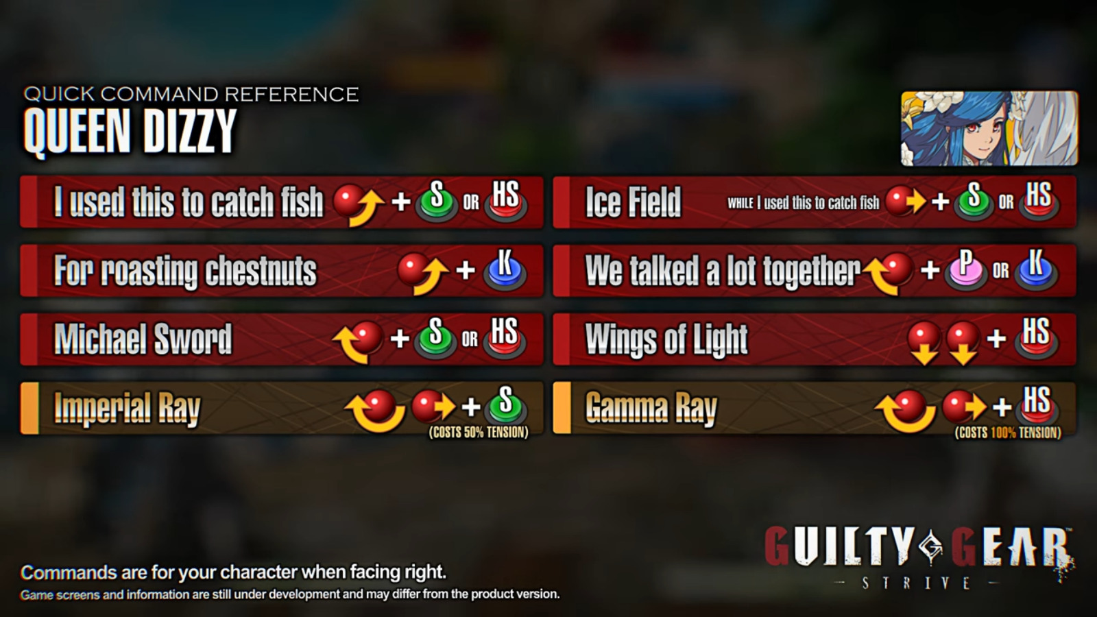 Before the release of this Guilty Gear Strive DLC character, Arc System Works published this official character guide. The moveset of Queen Dizzy have been nicely explained here.