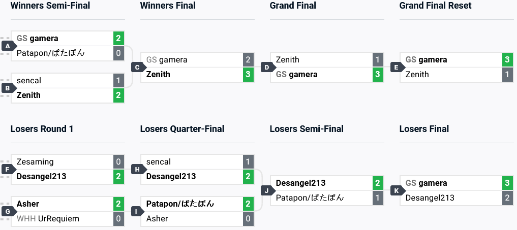 Gamera, who was 2nd at the GBVSR Evo Japan 2024, had some difficulties at TGU 2024 — specifically in a match against Zenith, the winner of FV Major 2024. Gamera lost to this opponent in the winners final and had to make it to the grand final via losers side. In the decisive battle, Gamera reset the brackets and then won the tournament.