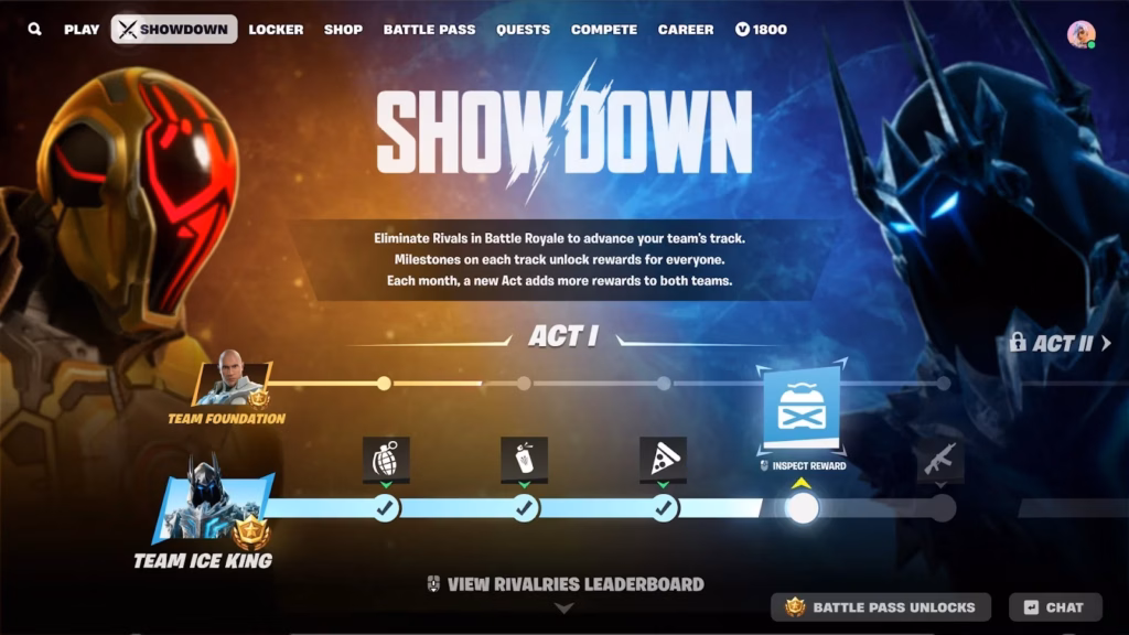 It appears Epic Games has separated the Fortnite Rivals feature by ‘Acts.’ Act I features ten unlockable items, or five for Team Foundation and five for Team Ice King. As the leaderboard unfolds over the coming weeks, one of those items will become available in-game for all players.