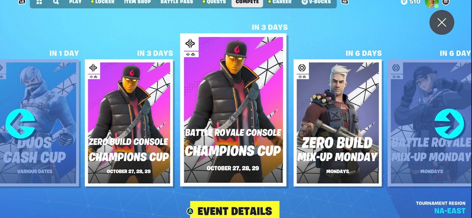If you meet all of these prerequesites, launch Fortnite on your console of choice, head to the “Compete” tab and choose which of the two Console Champions Cup competitions you’d like.