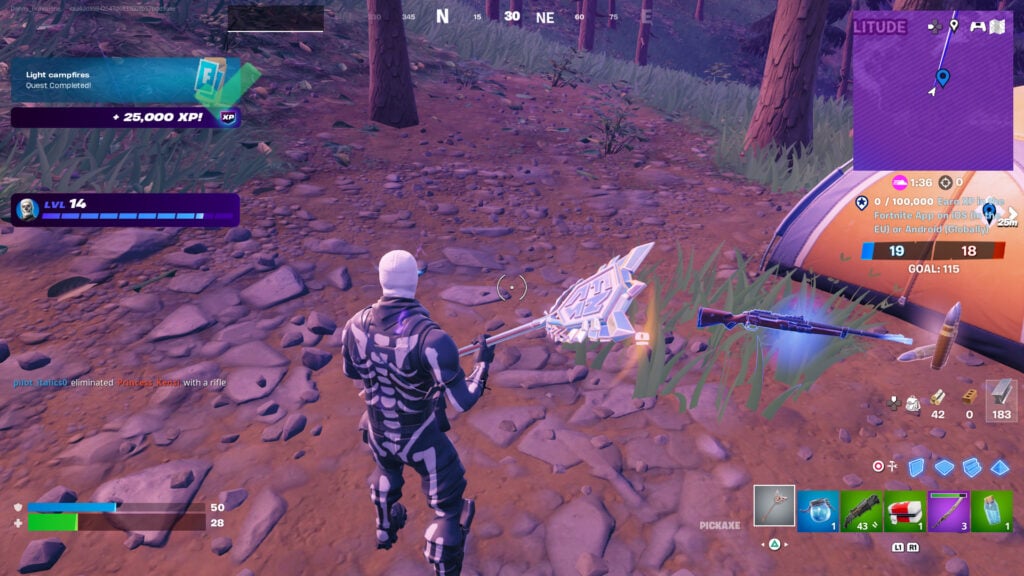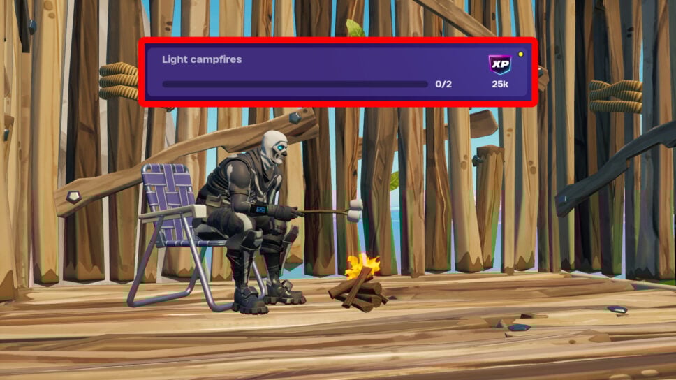 Upon finding two Campfire locations and lighting them, you will complete the challenge and receive 25K Fortnite XP. This XP counts simultaneously toward your Battle Pass, Music Pass, and LEGO Pass.