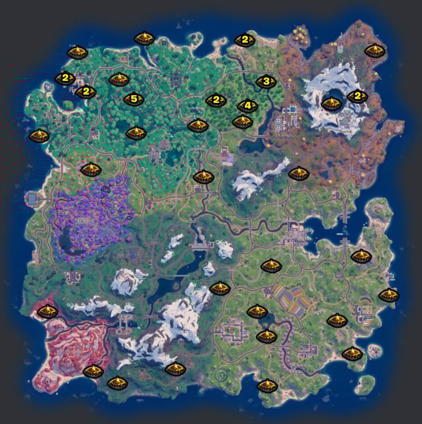 The image above shows where you can find all Campfires in the current Fortnite season. As you can see, there is no shortage of options except for the middle of the map. Your best bet is to stick to the forest area in the northwestern portion. You can utilize the generous number of Campfires to complete the week seven Quest.