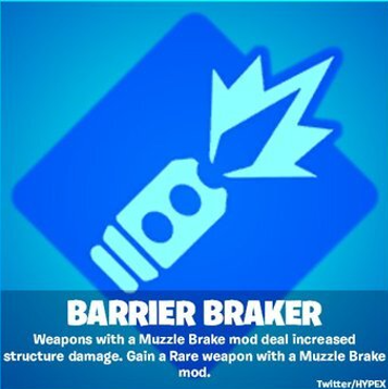 ![]() | Barrier Breaker | Weapons with a muzzle break mod deal increased structure damage. Gain a Rare weapon with a muzzle break mod. |